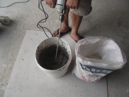 用秤稱量出標準的每包用水量,注入容器中記錄刻度,現在容器中注入干凈清水,粘結劑與水約4:1比例攪拌或均勻