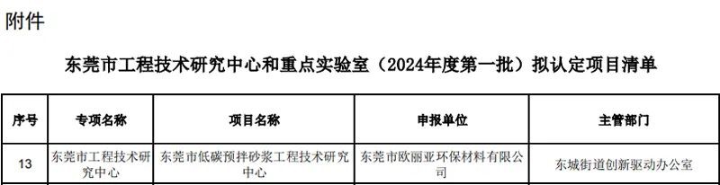 2024年訊——東莞市科學技術局發布了《東莞市工程技術研究中心和重點實驗室(2024年度第一批)擬認定項目的公示》(項目已過公示期),歐麗亞榮獲“東莞市工程技術研究中心認定企業”稱號。